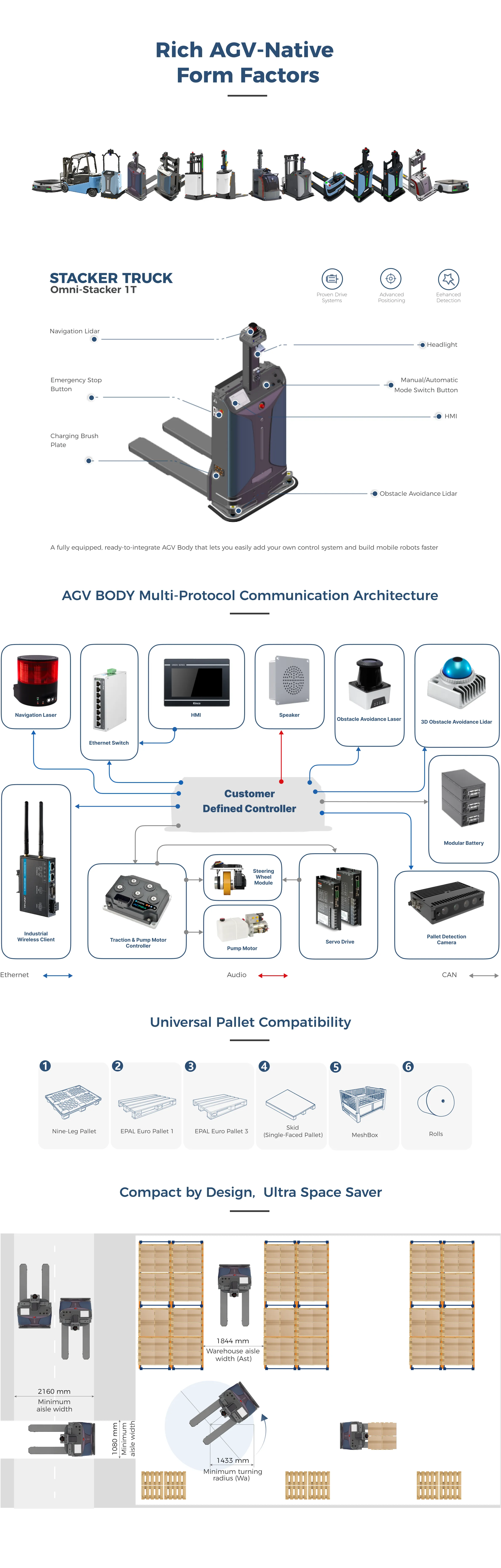 The PCOPCO Omni-Stacker 1T belongs to the industrial AGV components category, specifically as a stacker truck AGV part. It is designed for integration into automated material handling systems rather than standalone operation, supporting precise pallet handling in industrial facilities.